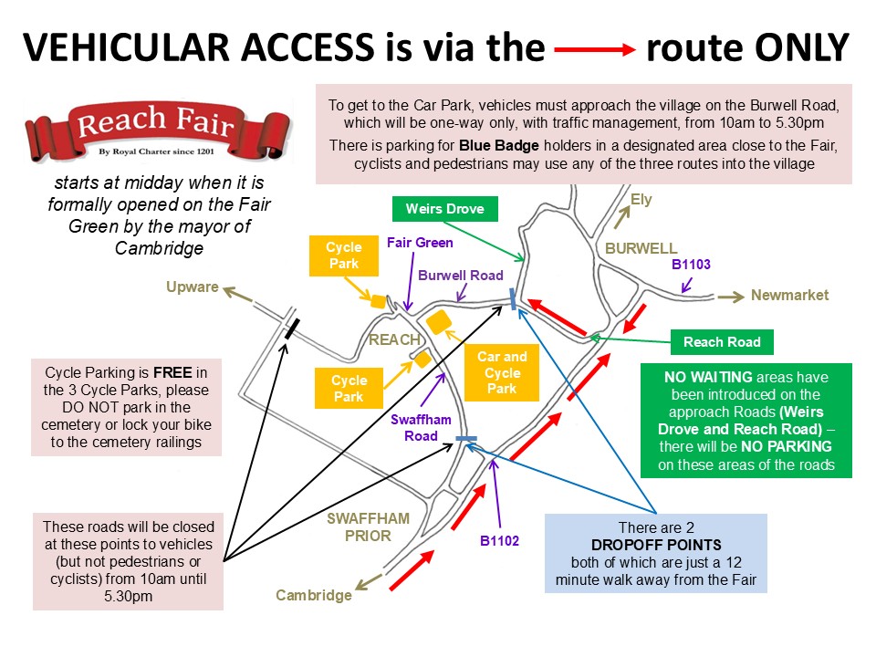 Reach Fair 2026 will take place on Monday the 4th of May. It starts at midday with an opening ceremony on the Fair Green conducted by the Mayor of Cambridge accompanied by the Aldermen in their full regalia and penny coins are scattered for the children. It closes at 5.00pm. The Accessing the Fair Map below should help exhibitors and visitors get to the Fair - for a printer friendly copy, click on the link. Please note that ALL vehicles that enter the Car Park will be charged £10, Motorbikes £5, regardless of the length of stay. The cost for Blue Badge Holders is £5, in a designated area of the car park, as close as we can get you to the Fair. Please be aware that all these charges relate to Reach Fair 2025 and may be subject to change for Reach Fair 2026. If all you want to do is drop someone off, we suggest you do this at one of the 2 DROP OFF POINTS which are just a 12 minute walk away from the Fair. Please also note that NO WAITING areas have been introduced on the approach Roads (Weirs Drove and Reach Road) – there will be NO PARKING on these areas of the roads. If you are using SatNav our postcode is CB25 0JD - also Google Maps is a great way to get directions to the Fair Green. Click on the link and key your postcode into Box A - Box B, centre of the map, shows where we are. And do especially note that Reach is on National Cycle Network Route 51 between Cambridge and Newmarket and close to Route 11 between Ely and Lode.